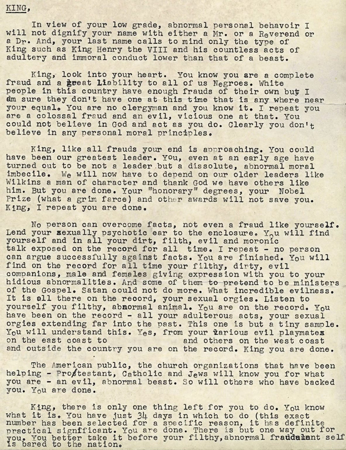 Another lesson that tends to get overlooked is that protest movements that are praised in retrospect were often perceived negatively by their contemporaries. King himself was relentlessly vilified during his lifetime. He was under FBI surveillance, and J. Edgar Hoover labeled him "the most notorious liar in the country" in 1964. That same year, the FBI even sent King an anonymous blackmail letter urging him to commit suicide.