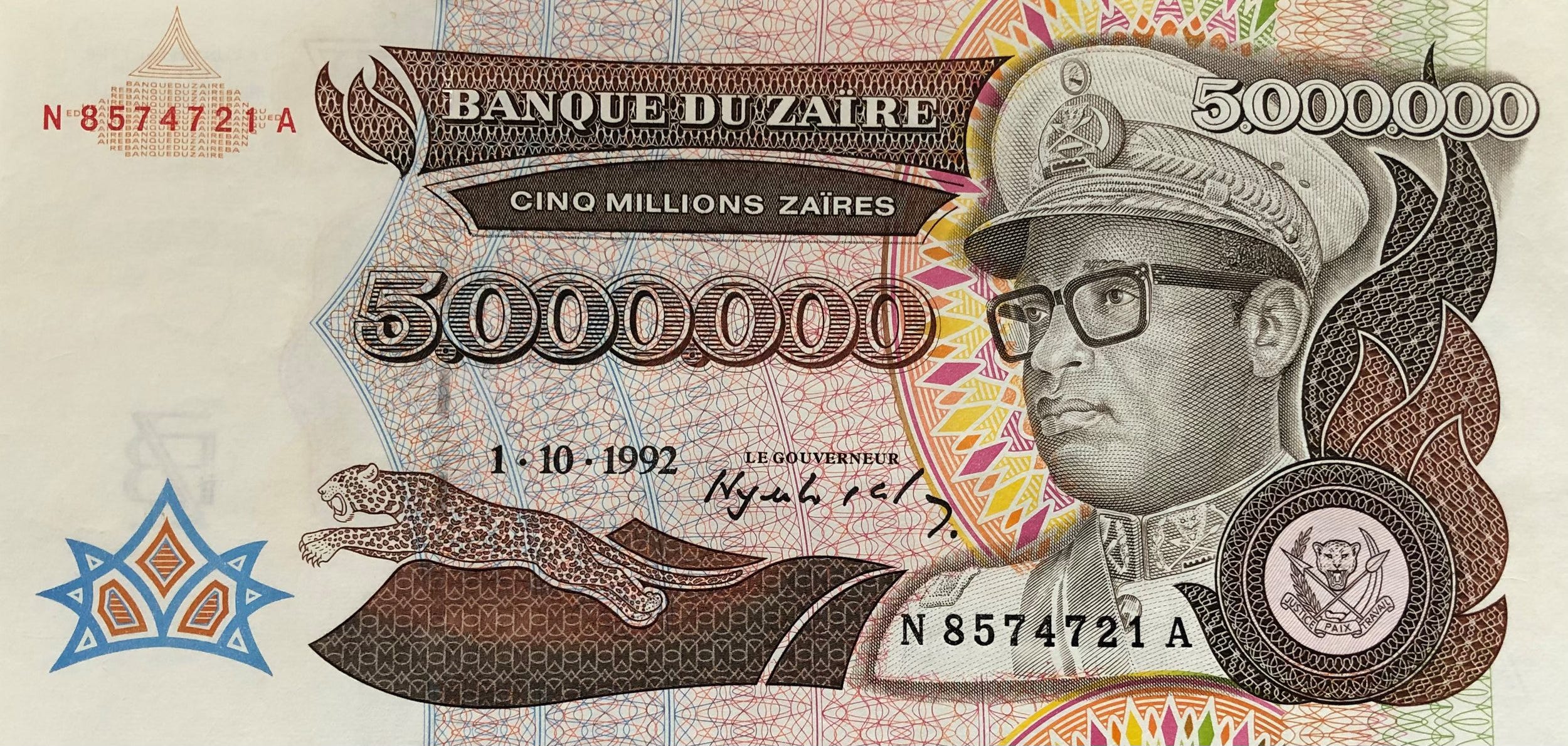 At the same time, the economy declined even further. Inflation was over 8000%, and at the end of 1992, Mobutu introduced a new note of 5 million zaires. It was only worth the equivalent of 3 US dollars.